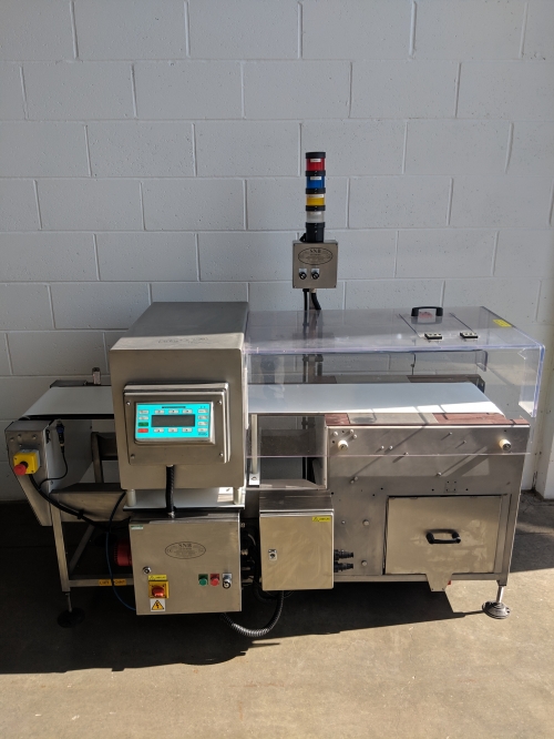 SNB’s stock number #559 is a Goring Kerr DSP2 metal detector. This system has an aperture 350mm wide by 175mm high tuned to a single frequency of 100KHz. The unit has a conveyor length of 18000mm with a white PU Belt that hands from left to right. Contaminated products are rejected by the retract band. A retract band rejection means the outfeed conveyor belt retracts creating a gap for the contaminated product to drop into.