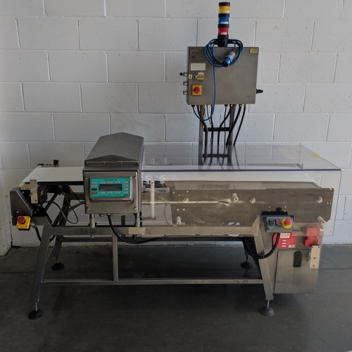 Stock number #205 is a Goring Kerr DSP2 with a 350mm (W) by 100mm (H) metal detector aperture. The conveyor is 2000mm long with a PU belt that runs from left to right. The system has a retract band rejection system.
