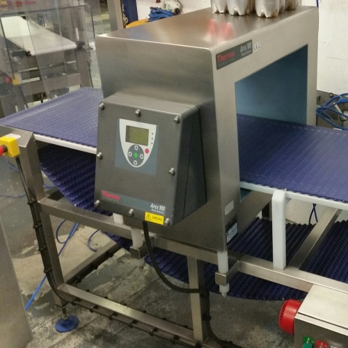 #541 has an aperture of 550mm wide by 350mm high and a dual frequency of 100KHz and 300KHz. This system has an overall stainless steel and a conveyor length of 2000mm. The belt is blue modular belt which runs from right to left. #541 is constructed onto standard feet and has an Alarm Belt Stop (Stop On Detect) reject type.