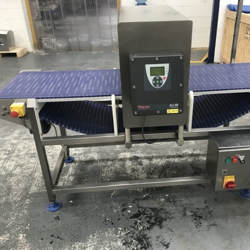 #595 Thermo Apex 100 has a metal detector head 550mm wide by 350mm high and has a dual frequency. The unit can run at 100KHz or 300KHz. The conveyor has a blue modular belt that runs from right to left and has a length of 2000mm. This metal detector has an alarm belt stop reject system meaning the unit will stop the belt and alarm on detection.